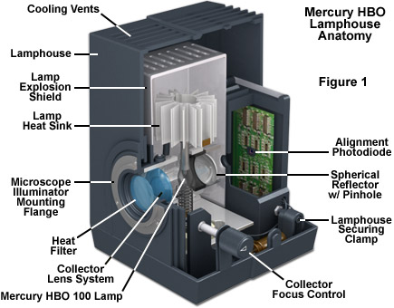 In a typical optical microscope configuration, the mercury lamp is positioned inside a specialized illuminator consisting of a lamp housing containing the lamp, a concave reflector mirror, an adjustable collector lens system to focus the lamp output, an electrical socket for securing and alignment of the bulb, and the external power supply (Figure 1). Depending upon the design, mercury arc lamphouses may also contain filters to block ultraviolet wavelengths and hot mirrors to block heat from entering the microscope optical train. Many lamphouses also contain external heat sinks to dissipate heat and vents that allow the dissipation of hotter air, while others also feature a large cooling fin attachment to the lamp itself (see Figure 1). In addition, the lamphouse must contain an adjustment knob for the collector lens position and provisions (either knobs or screws) for alignment of the lamp and the reflector. Of primary concern is that the lamphouse itself must not leak harmful ultraviolet wavelengths and should incorporate a switch to automatically shut the lamp down should the housing be compromised or opened during use.