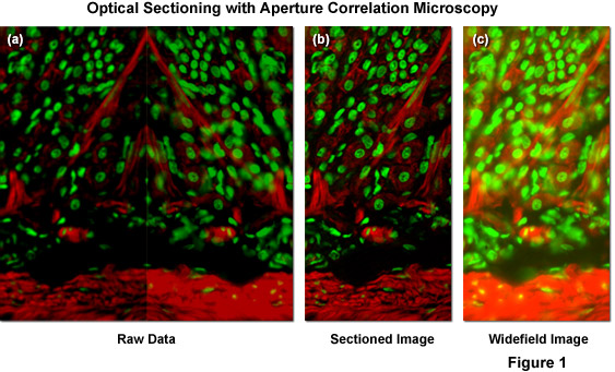 Illustrated in Figure 1(a) is typical raw image data generated by a ZEISS VivaTome aperture correlation microscope, as well as images representing the calculation of an optical section using equation (1) and (2) above. The specimen is a thick (16 micrometers) cryosection of rat stomach (fundus region) stained with Alexa Fluor 568 conjugated to phalloidin to highlight filamentous actin and counterstained with SYTOX Green to label nuclei. Within the raw image data, both the fluorescence detected passing through the disk (containing a conjugate image containing both widefield plus in-focus information; right side of Figure 1(a)), and fluorescence rejected at the disk (a non-conjugate image containing widefield data minus the in-focus information; left side of Figure 1(a)) are contained. During post-acquisition image processing both images are extracted, one half is mirrored, and both images are registered to account for differences in the imaging paths. A scaled subtraction results in an optically sectioned image (Figure 1(b)), whereas a scaled addition results in a conventional widefield image (Figure 1(c)). Thus, a scaled subtraction of the two image halves results in one image containing only the confocal information and a scaled addition of both image halves adds all the intensity from the specimen to produce a normal widefield image.