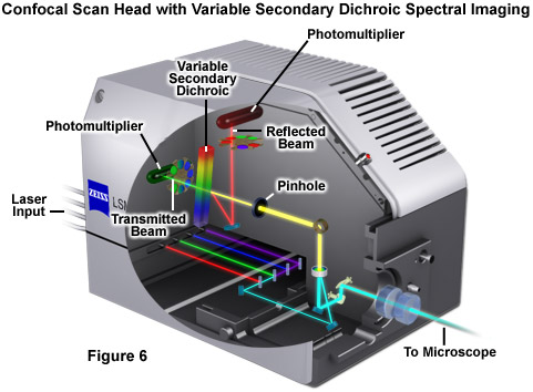 Perhaps the simplest configuration using a laser scanning confocal microscope for spectral imaging couples a diffraction grating with an adjustable slit that can be mechanically translated across the input window of the photomultiplier detector. Fluorescence emission passing through the pinhole is reflected onto the diffraction grating surface using a dichromatic mirror. The spectrally separated light is then projected through the slit and into the photomultiplier. The spectral bandwidth can be modulated by increasing or decreasing the slit size and the wavelength region presented to the photomultiplier is determined by the position of the slit in relation to the dispersed light from the grating. Another innovative, yet simple, design incorporates an interference filter device termed a variable secondary dichroic (VSD), which serves as a beamsplitter to direct selected wavelength bands into separate photomultiplier detectors (see Figure 1). The vertical position of the VSD unit with respect to the emission beam in the confocal optical train determines the wavelength band that is transmitted to the first of two photomultipliers. The second photomultiplier receives light of longer wavelength that is reflected from the surface of the VSD. Wavelength selection using the VSD is easily achieved simply by shifting the position of this dichromatic beamsplitter element.